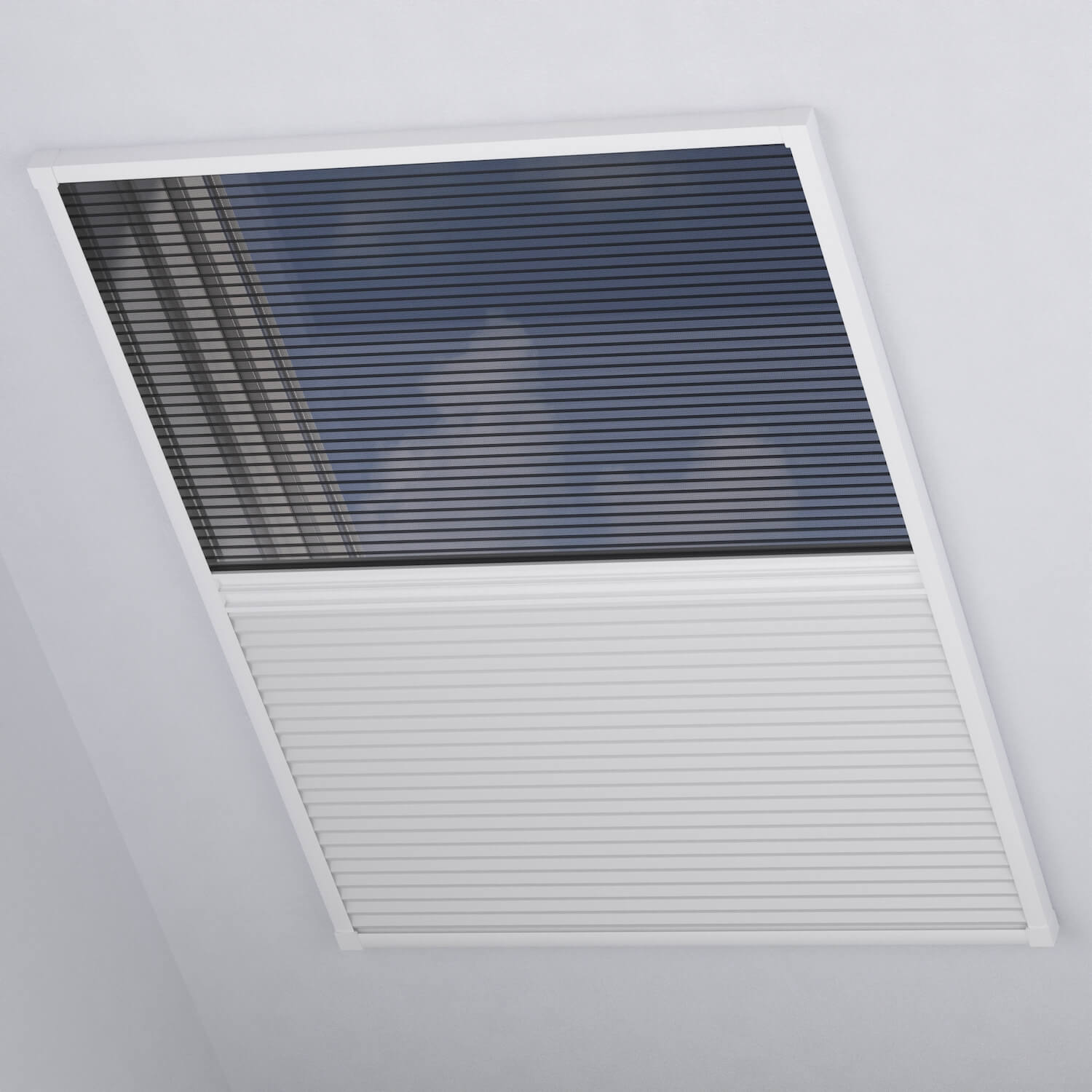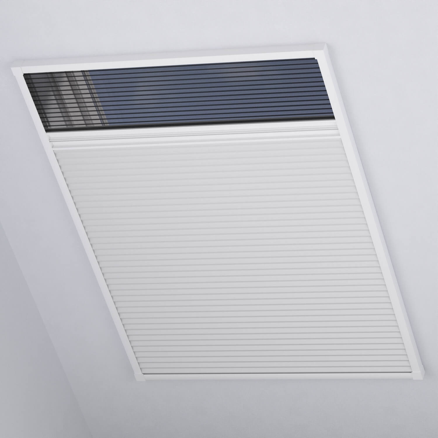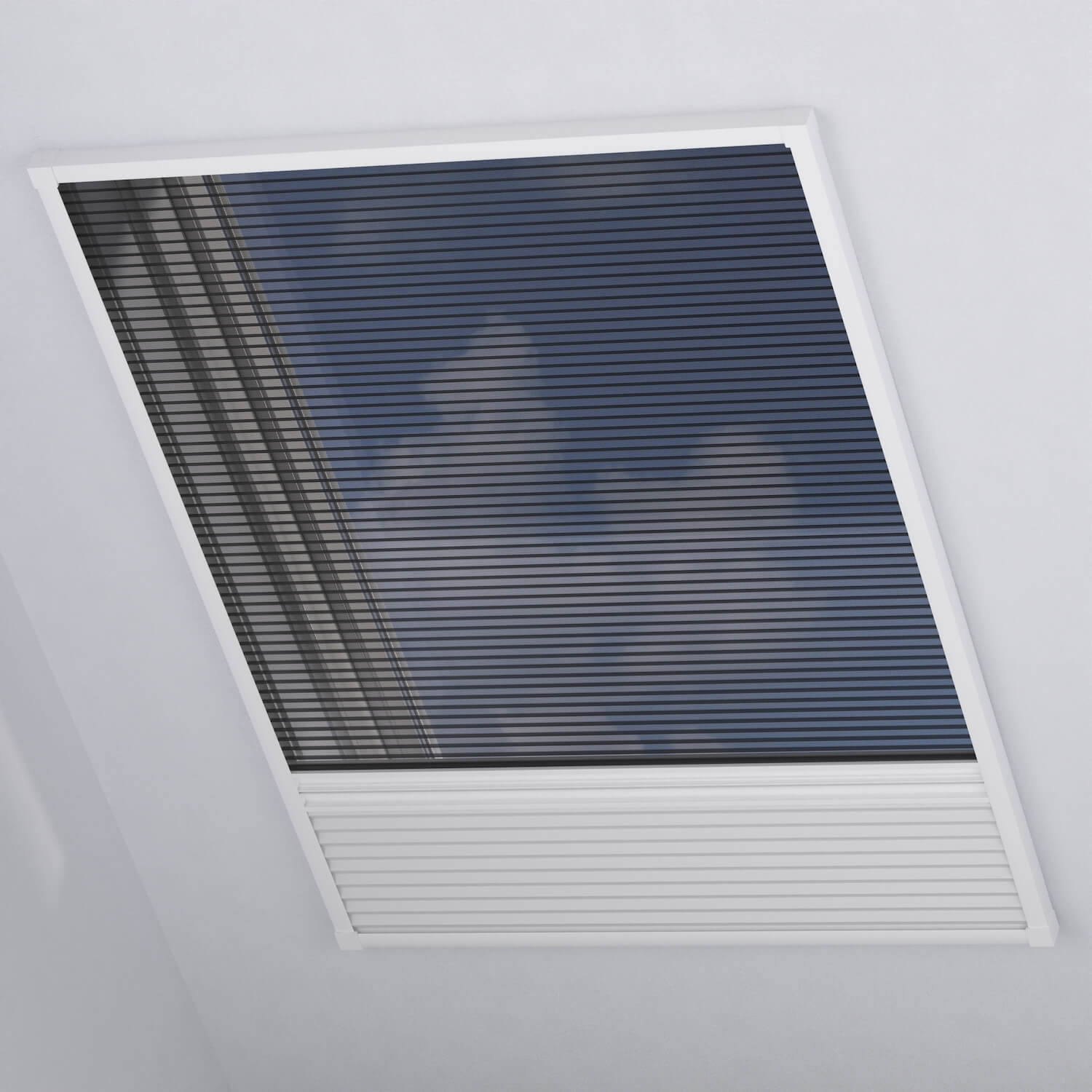 Ce store plissé avec moustiquaire est particulièrement adapté aux fenêtres de toit. Ce système permet de faire rentrer l’air frais dans une pièce, tout en empêchant les insectes d’y entrer. Le tissu occultant assure aussi que la lumière du jour ne puisse pas entrer. Grâce à la structure du tissu en nid d’abeille, la toile a d’excellentes propriétés isolantes. Cet effet est assuré par le revêtement argenté à l’intérieur du tissu en nid d’abeille. Il est facile de raccourci le store en largeur et en hauteur et, selon le type de fenêtre, il peut être facilement monté sur le mur autour de l’ouverture de la fenêtre.